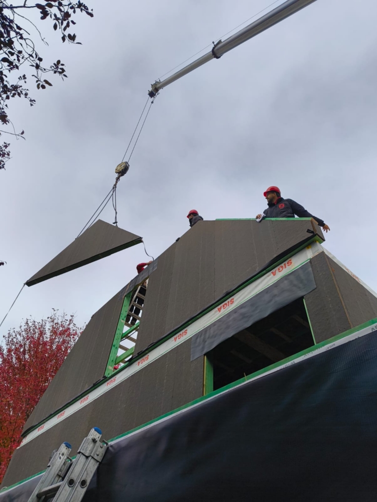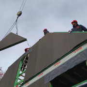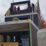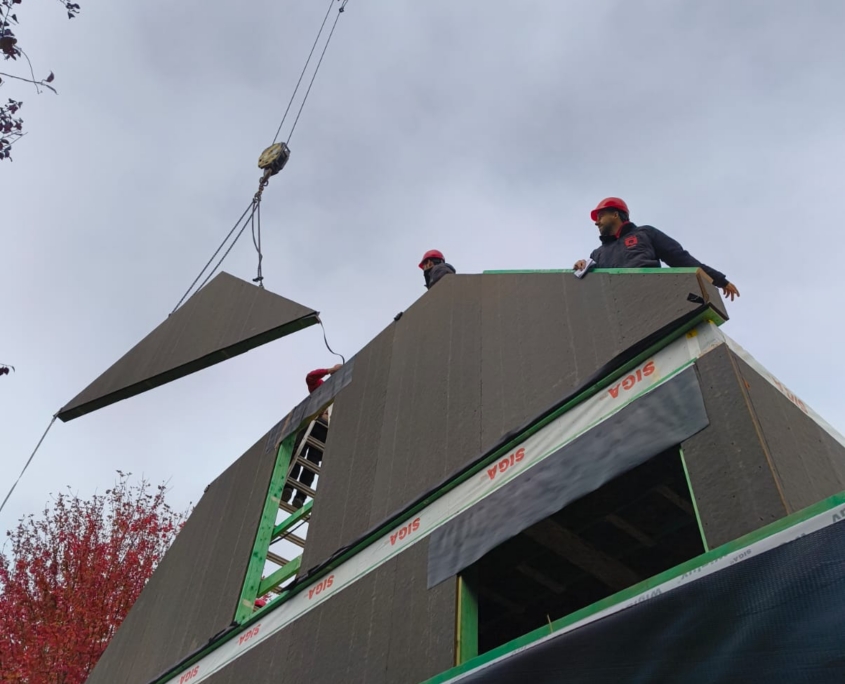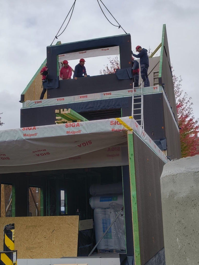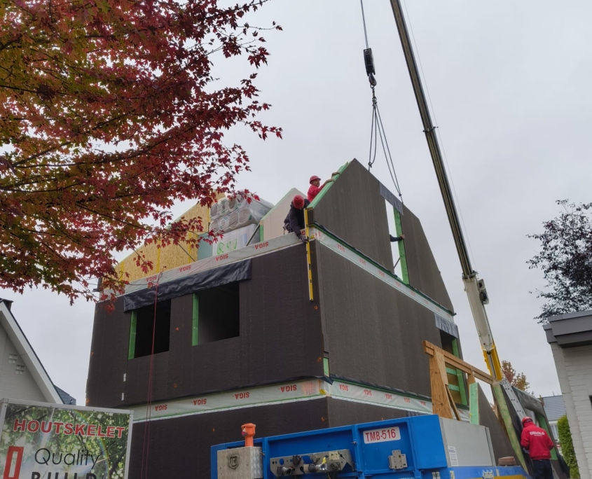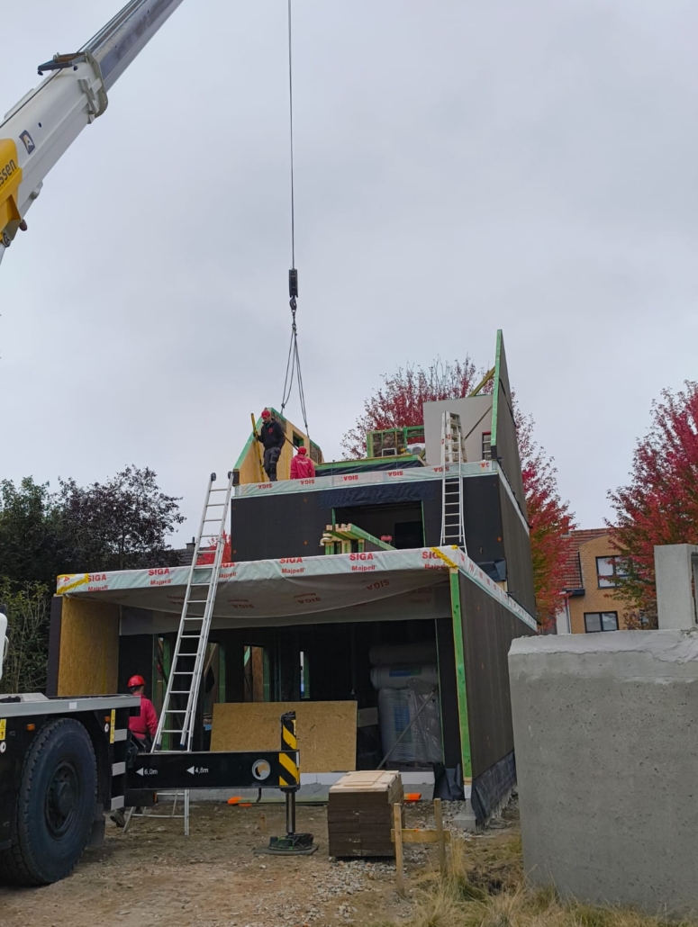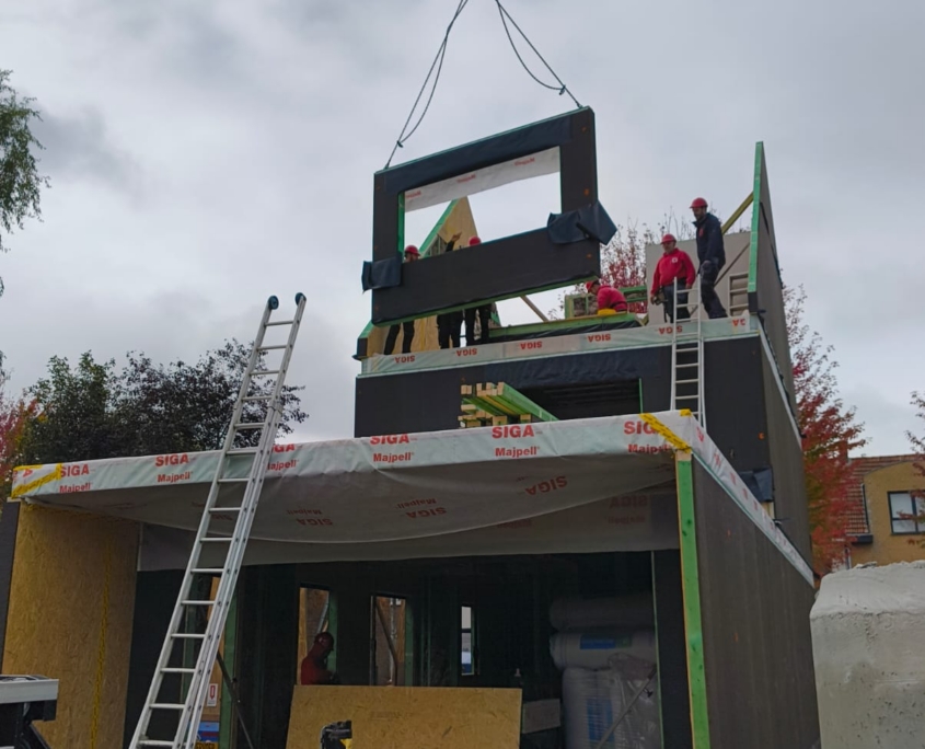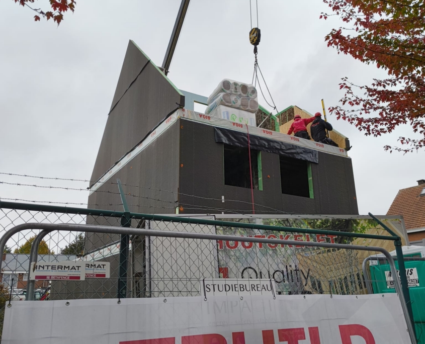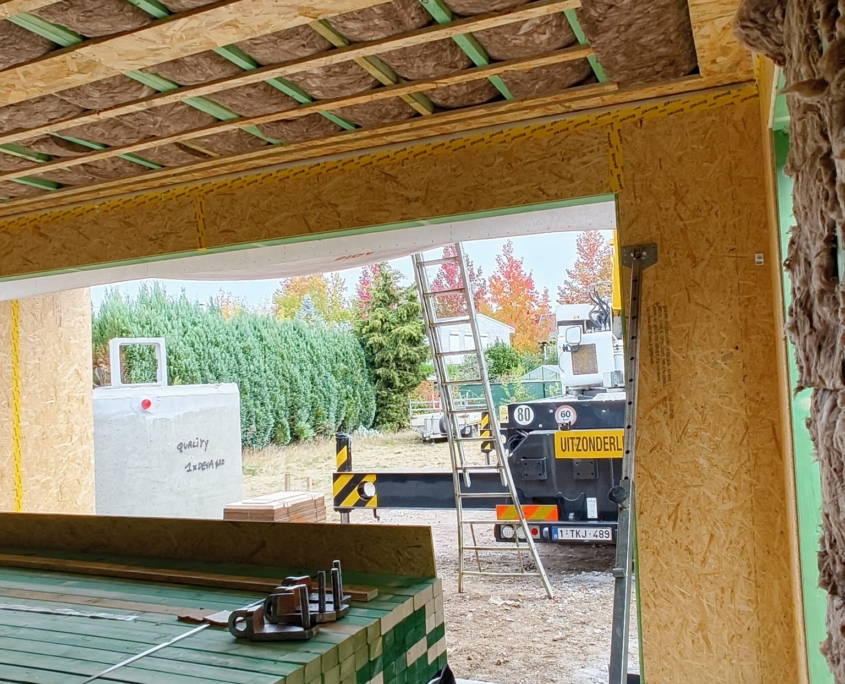 De ruwbouw bestaat bij onze bouwmethode uit modulaire houtskelet elementen die luchtdicht en voorgeïsoleerd afgewerkt worden nog vóór ze de werf bereiken.